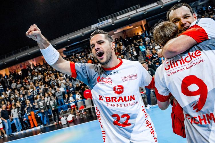 "So jubelten sie im November in Berlin – im Hinspiel bezwang die MT die Füchse mit 26:24 (v.l.: Allendorf, Reichmann, Maric)". (Alibek Käsler-Archivfoto )